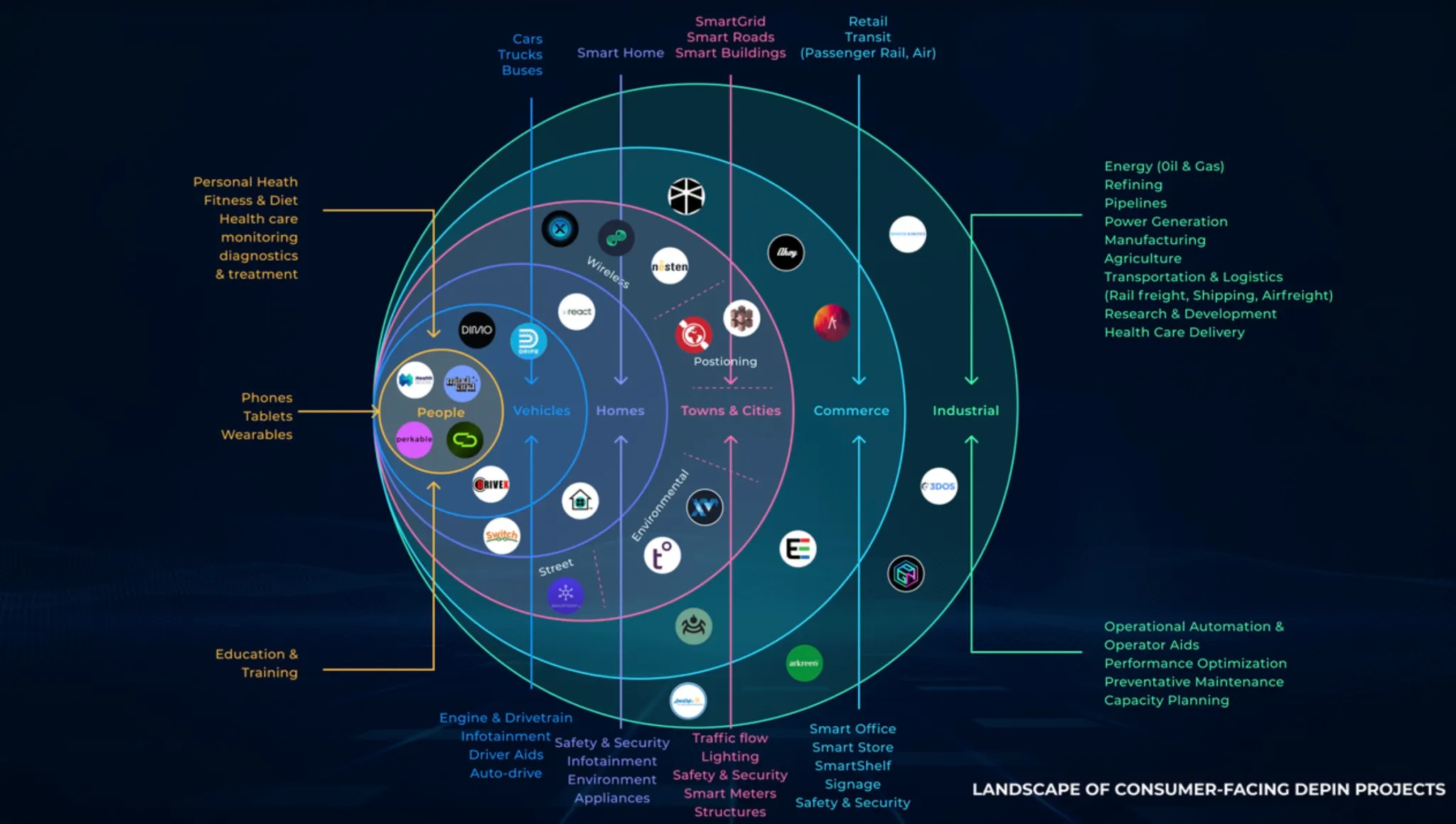 Please review the diagram above for additional DePIN sectors, including smart offices, smart stores, smart shelves, transit, buildings, roads, and grids. We can envisage most, if not all, of the IoT infrastructure of smart cities and critical infrastructure running on DePINs.